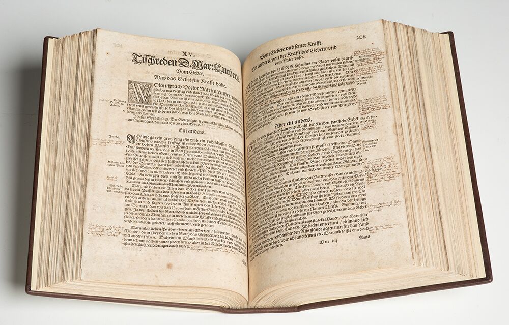 Das Buch umfasst Tischreden, Briefe oder Vorlesungen des Reformators Martin Luther. Aufgeschrieben, gesammelt und geordnet wurde diese ab 1540 von Johann Auri Faber, einem Schüler Luthers. Die überlieferten Aussprüche Luther beinhalten auch Aussagen zu Einzelpersonen wie dem Papst und Thomas Müntzer oder Anmerkungen zu Ehe, Krankheit und Tod. Die Ausgabe im Sammlungsbestand der Mühlhäuser Museen enthält zahlreiche handschriftliche Anmerkungen aus dem 16. Jahrhundert.